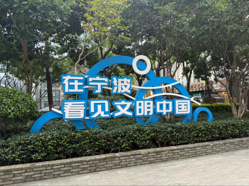 ホテル周辺は緑が多く、散歩するだけでも気持ちの良い環境です。宁波の街並みを象徴する看板が印象的でした。