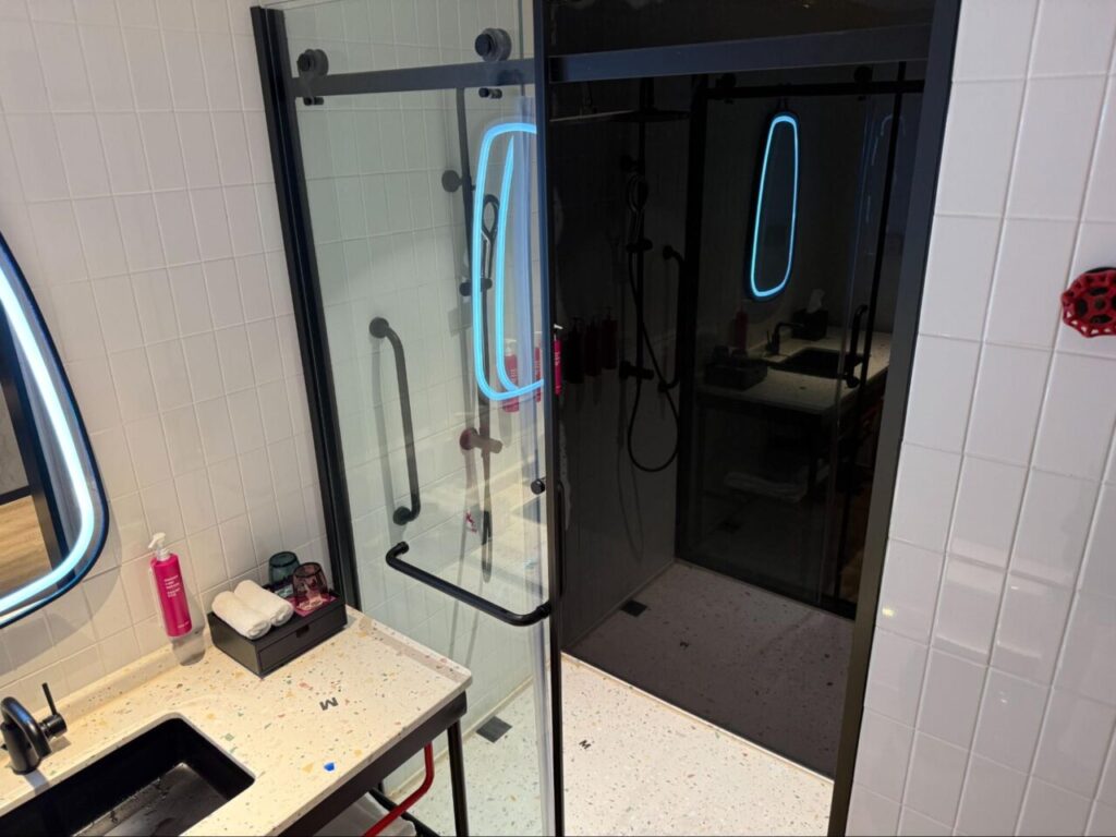 ガラス張りのシャワールームは広さがあり、シャワーの水圧が強くて最高! 温度調整もスムーズで毎回リフレッシュできました。さらに、アメニティーも豊富で滞在中に困ることはありませんでした。